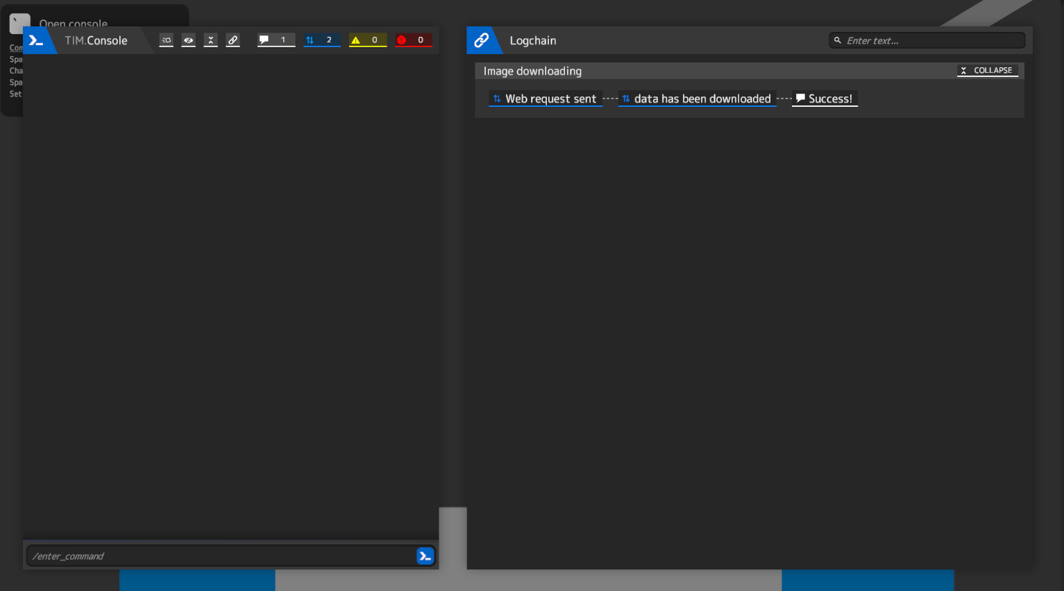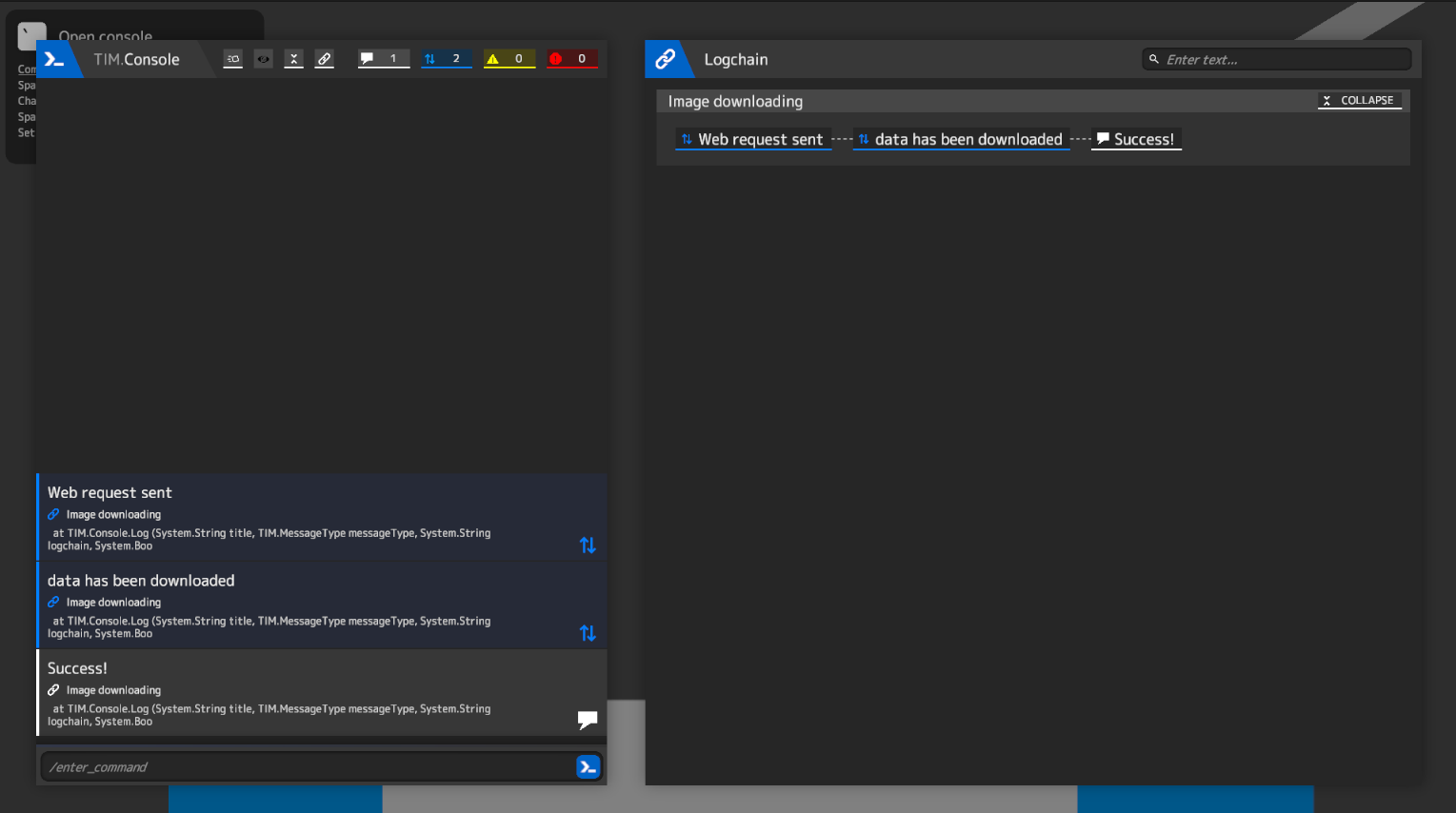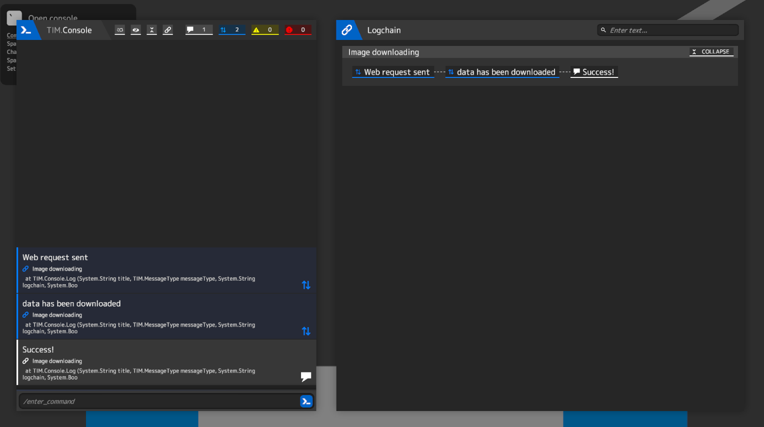 Lets take our last example with downloading image. If we will download images many times we will have many messages in Console. But we can organize it better! We can hide logs in Console but keep them visible in Logchain window. You just need to set last argument `hidden` of `TIM.Console.Log()` function to true:
